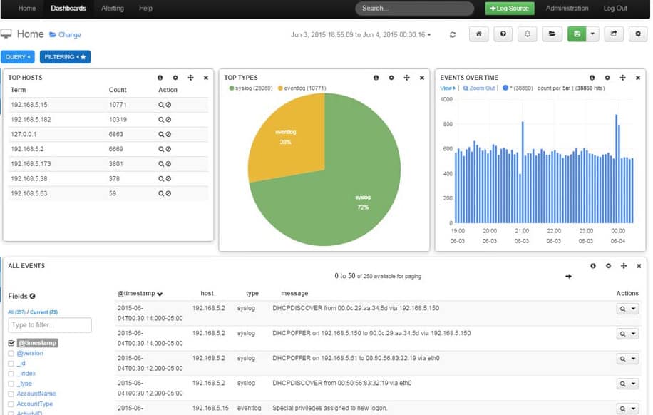 The default view is that of all logs over time, to give an overview of incoming events, but queries can also be input to search for specific log types. One can also filter using a large selection of options including timestamp, ID, host, message, severity, program, and more. There is also a logical NOT gate where you can exclude items that fit the selected criteria. - Live Reporting: